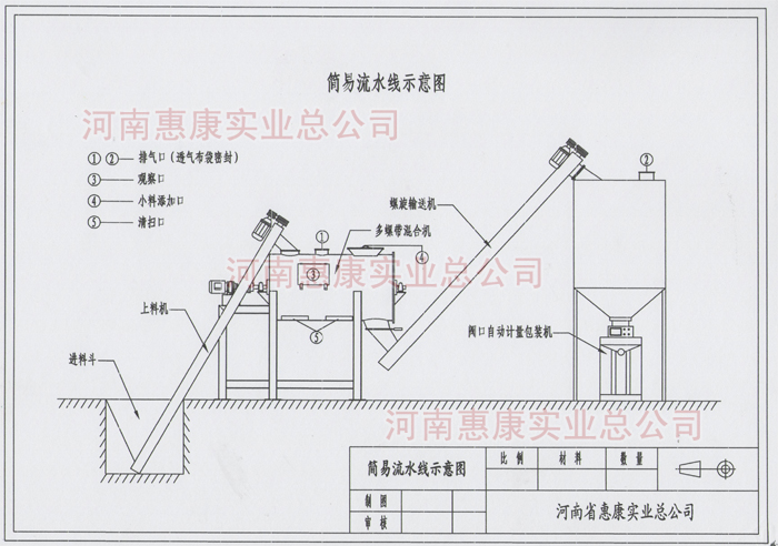 簡易型流水線主要由螺旋上料機(jī)、多螺帶混合機(jī)、二次提升機(jī)、儲料倉、閥口自動(dòng)定量包裝機(jī)等組成。