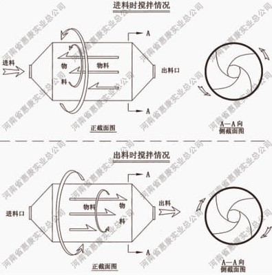 攪拌時,物料隨筒體沿逆時針方向旋轉(zhuǎn)的同時,在慣性作用下向左推移,從而達(dá)到混合目的。